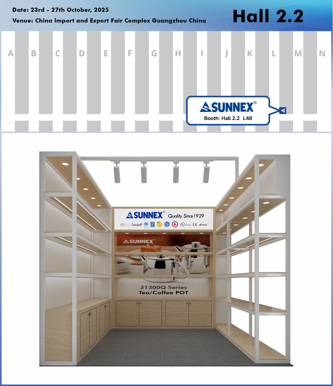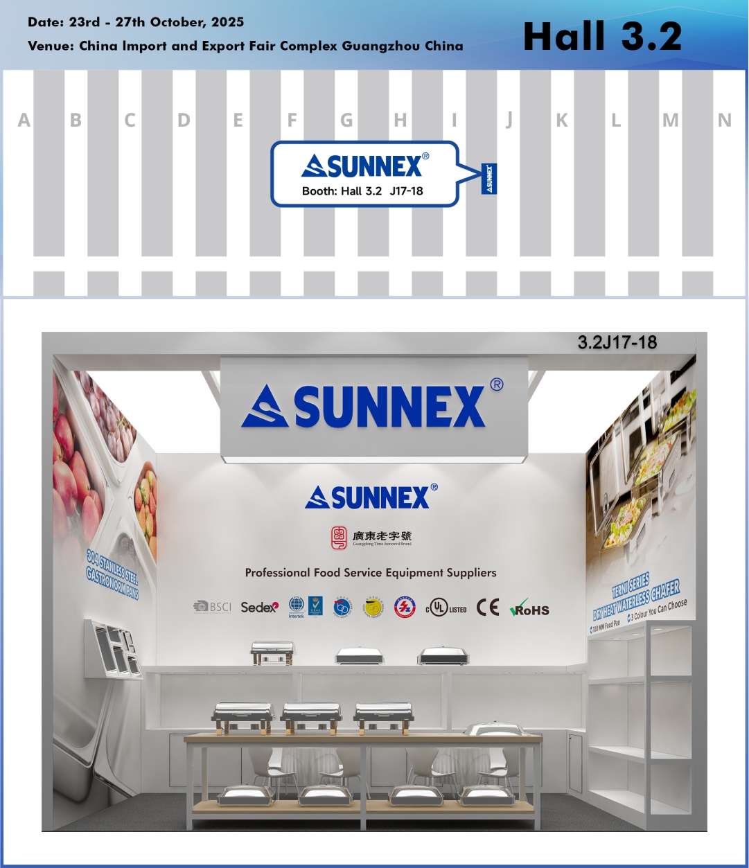 Guangdžou, Kinija – 2025 m. spalio mėn. – SUNNEX Century (Shenzhen) Ltd., pirmaujanti aukščiausios kokybės savitarnos indų, šveitimo indų, gėrimų dalytuvų ir buities reikmenų gamintoja, su malonumu pakviečia tarptautinius pirkėjus, žiniasklaidos ir pramonės specialistus apsilankyti mūsų stenduose 138-ojoje Kinijos importo ir eksporto mugėje (Kantono mugėje).